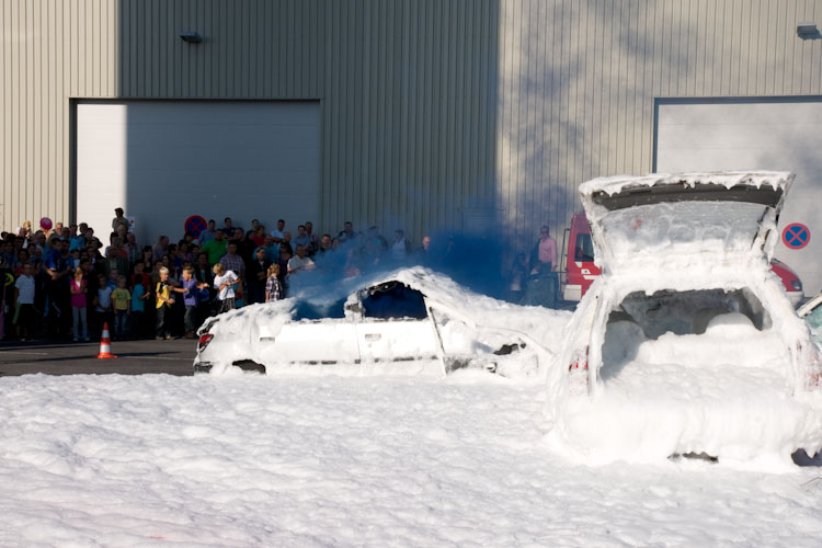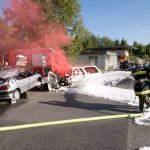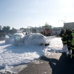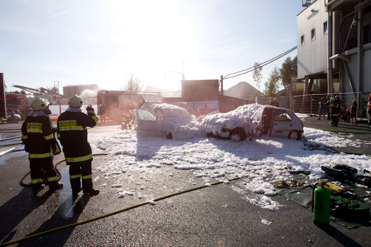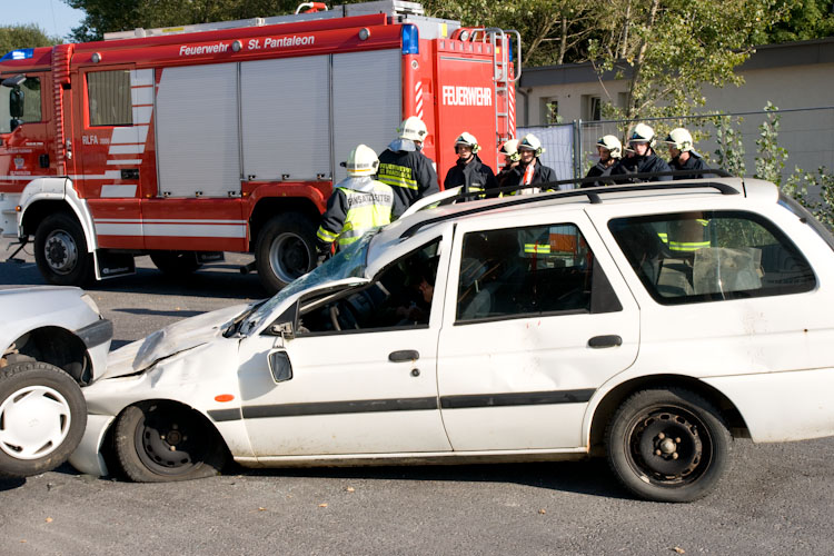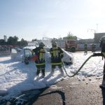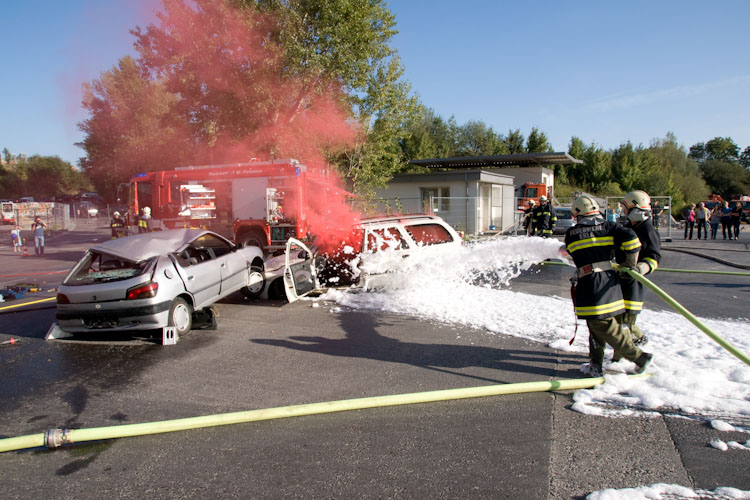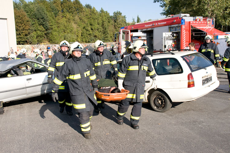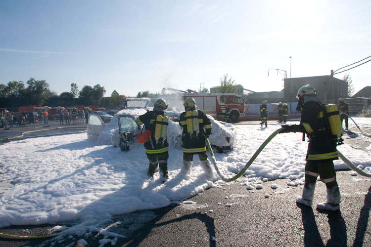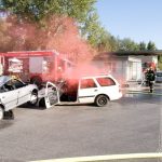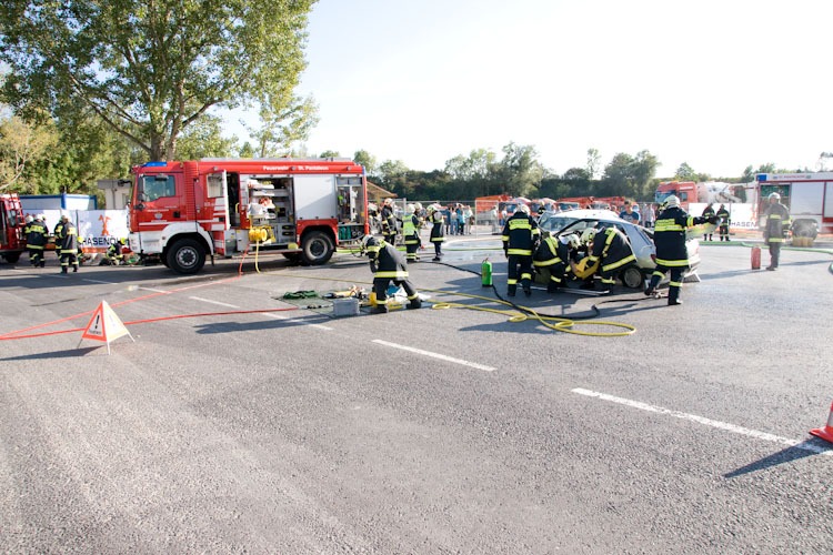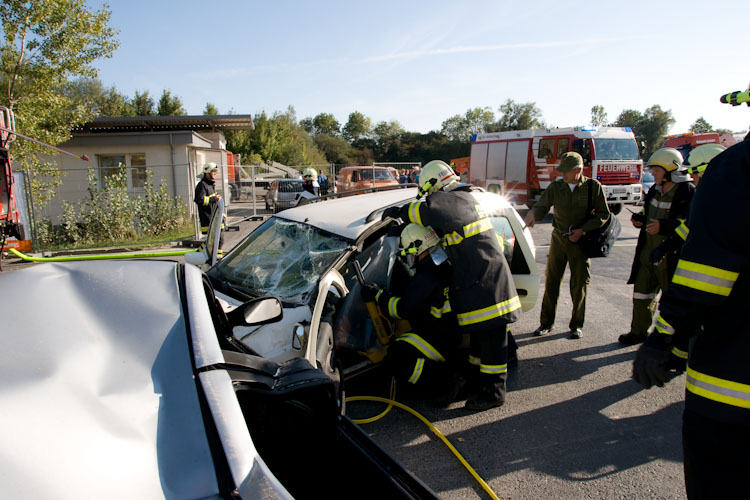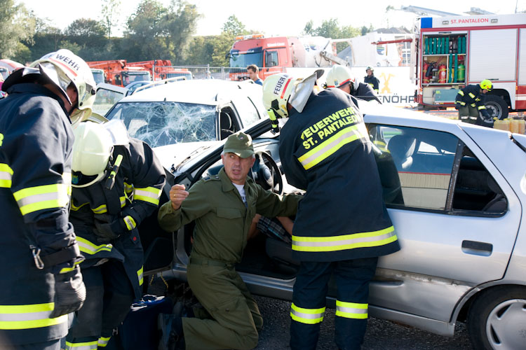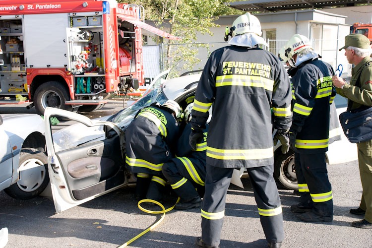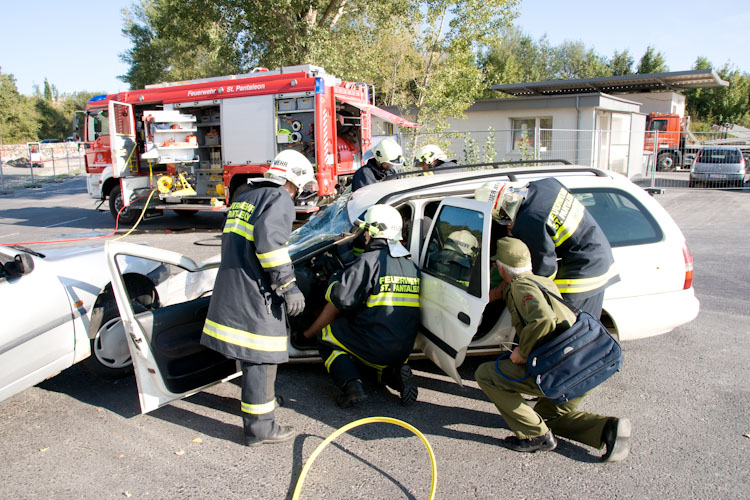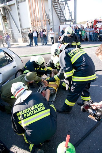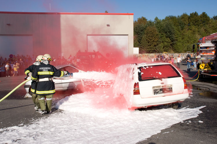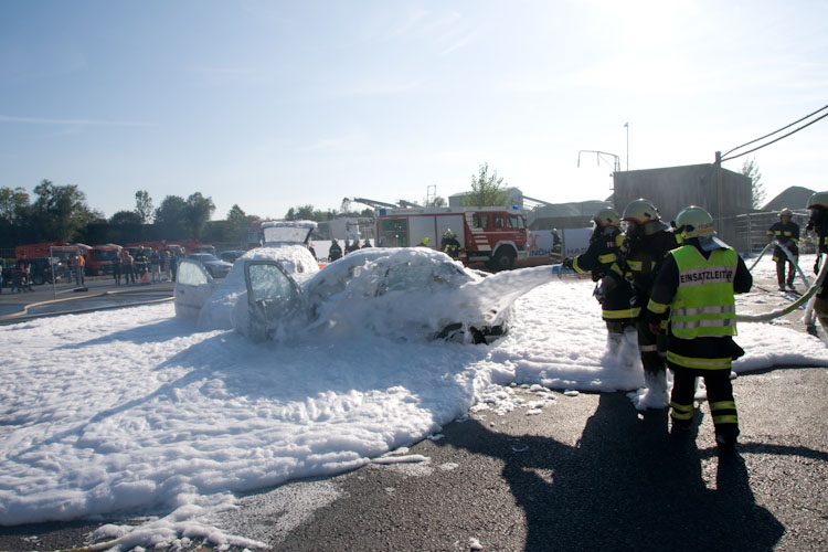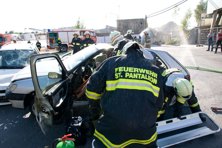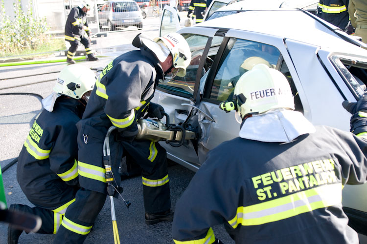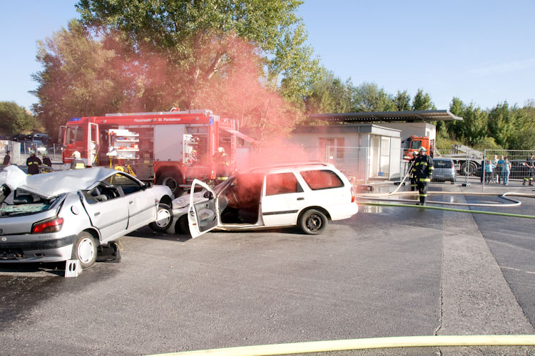Übungsannahme war ein Verkehrsunfall mit Menschenrettung und Fahrzeugbrand. Die Menschenrettung wurde durch die FF St. Pantaleon mit dem neuen RLF-A und die Brandbekämpfung durch die FF Erla mit Mittelschaum und schwerem Atemschutz durchgeführt.