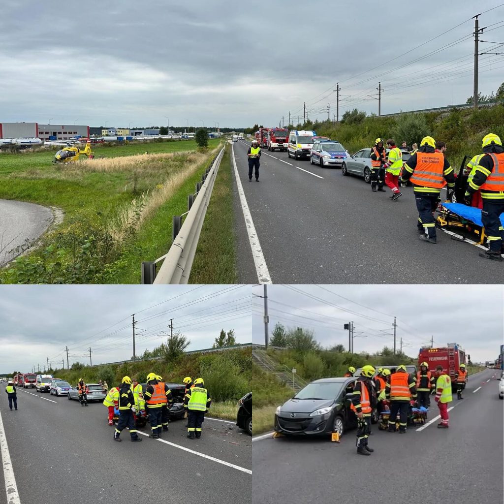 Am Donnerstagnachmittag wurde die Freiwillige Feuerwehr St. Pantaleon gemeinsam mit der Feuerwehr Ennsdorf zu einem Verkehrsunfall mit Menschenrettung auf die B1 bei Kilometer 166,6 in Ennsdorf alarmiert. Aus bisher ungeklärter Ursache kam es zu einem Auffahrunfall mit drei beteiligten Fahrzeugen. Eine Person befand sich noch im Fahrzeug.