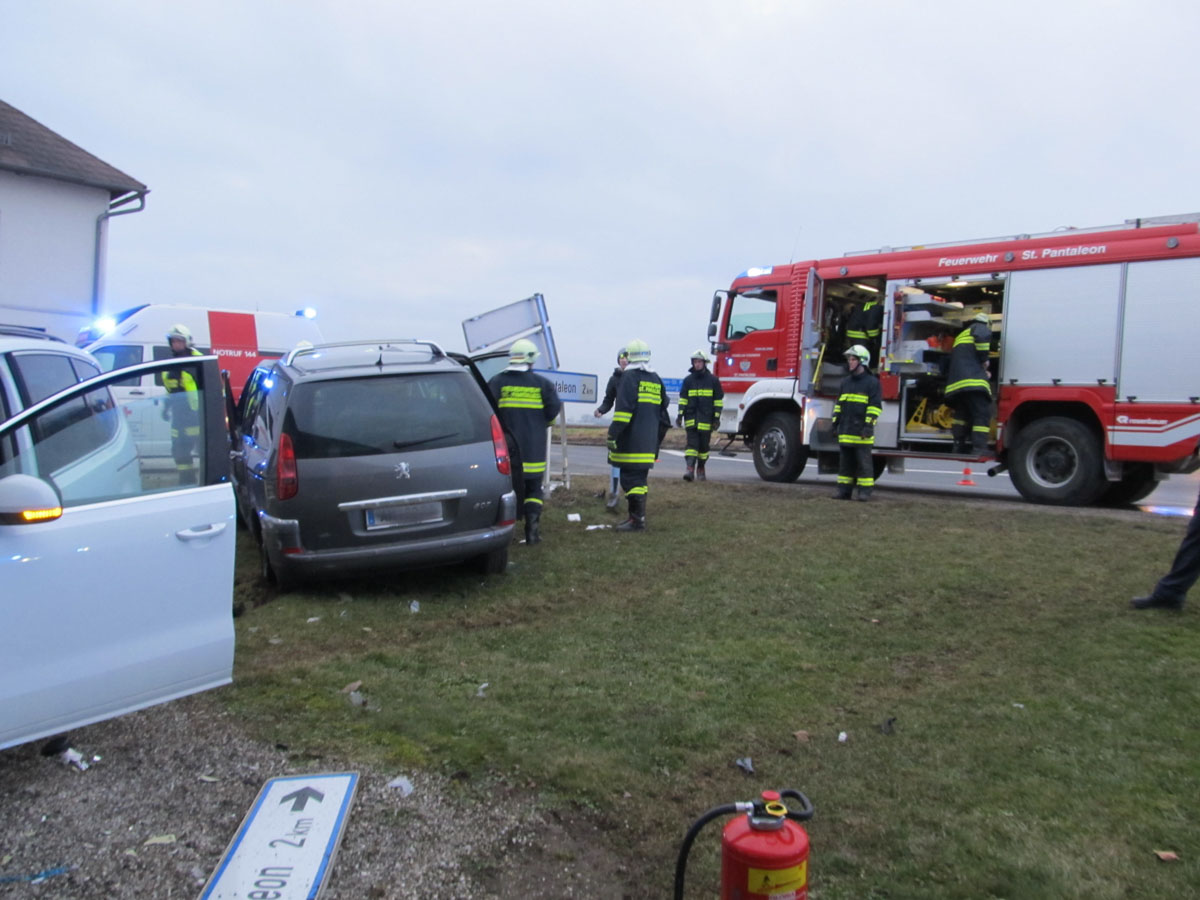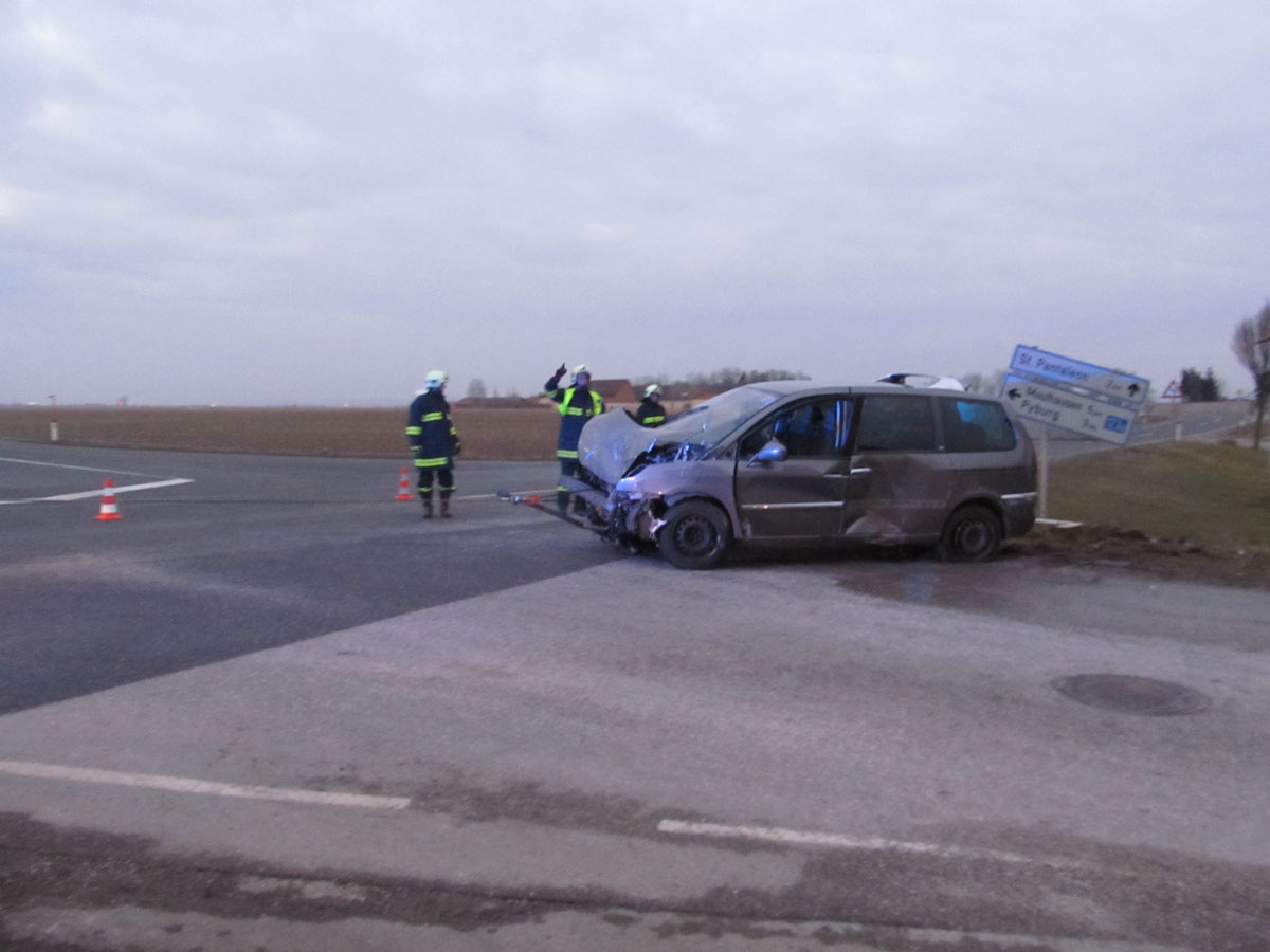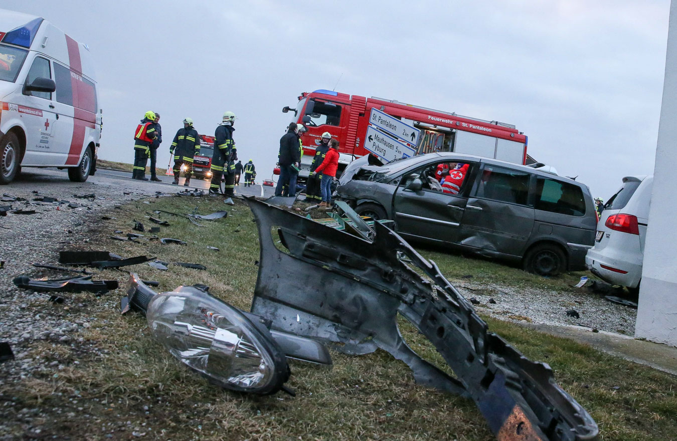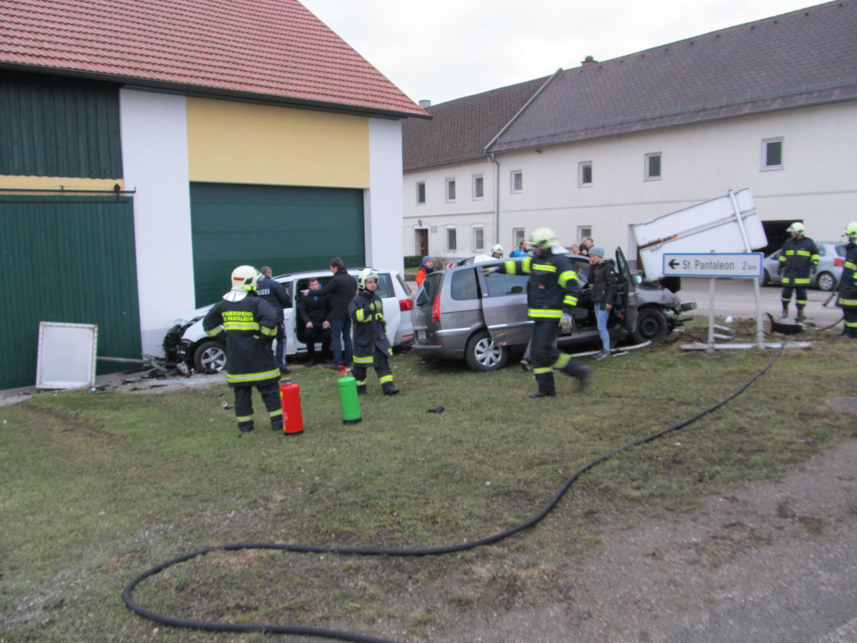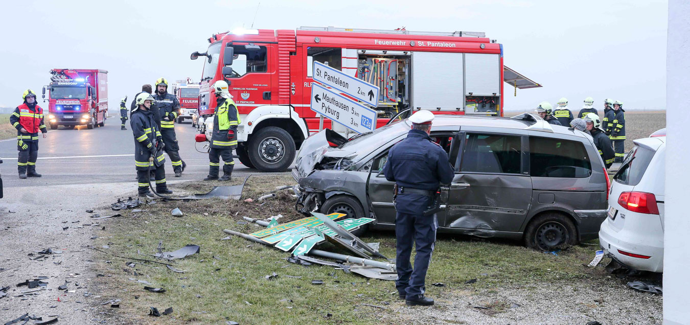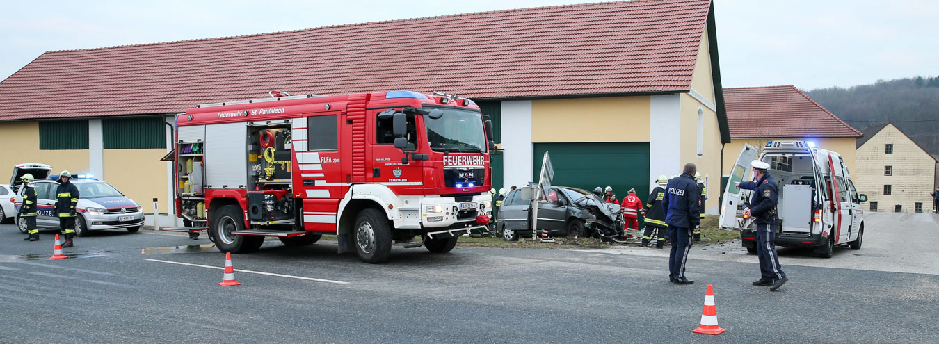18. Februar 2017 Aus bislang unbekannter Ursache kollidierten am späten Samstag Nachmittag zwei Fahrzeuge an der Kreuzung der B123 und B123a im Bereich Stögen bei St. Pantaleon. Bei dem Zusammenprall wurden drei Personen unbestimmten Grades verletzt, zwei Personen wurden nach der Behandlung durch den Notarzt in ein Linzer Spital gefahren. An beiden Fahrzeugen entstand erheblicher Sachschaden. Nach der Aufnahme des Unfalls durch die Polizei konnte die Feuerwehr St. Pantaleon die Bergung der beiden Wracks durchführen und die Unfallstelle reinigen, sowie ausgetretene Betriebsmittel binden. Die ebenfalls alarmierte Feuerwehr Ennsdorf konnte bald wieder einrücken, als klar war, dass keine Menschenrettung mehr erforderlich ist. Während der Unfallaufnahme sowie der Bergearbeiten war die Kreuzung erschwert passierbar.
