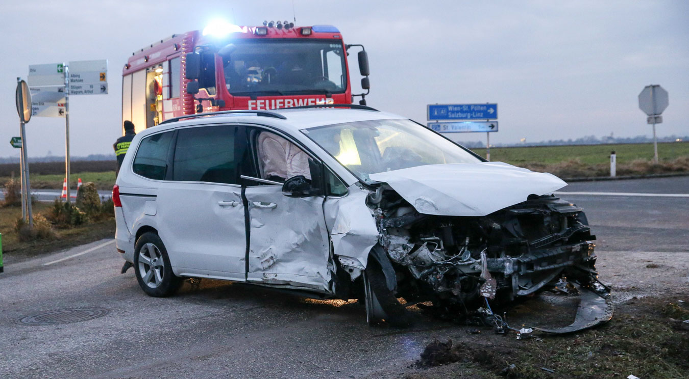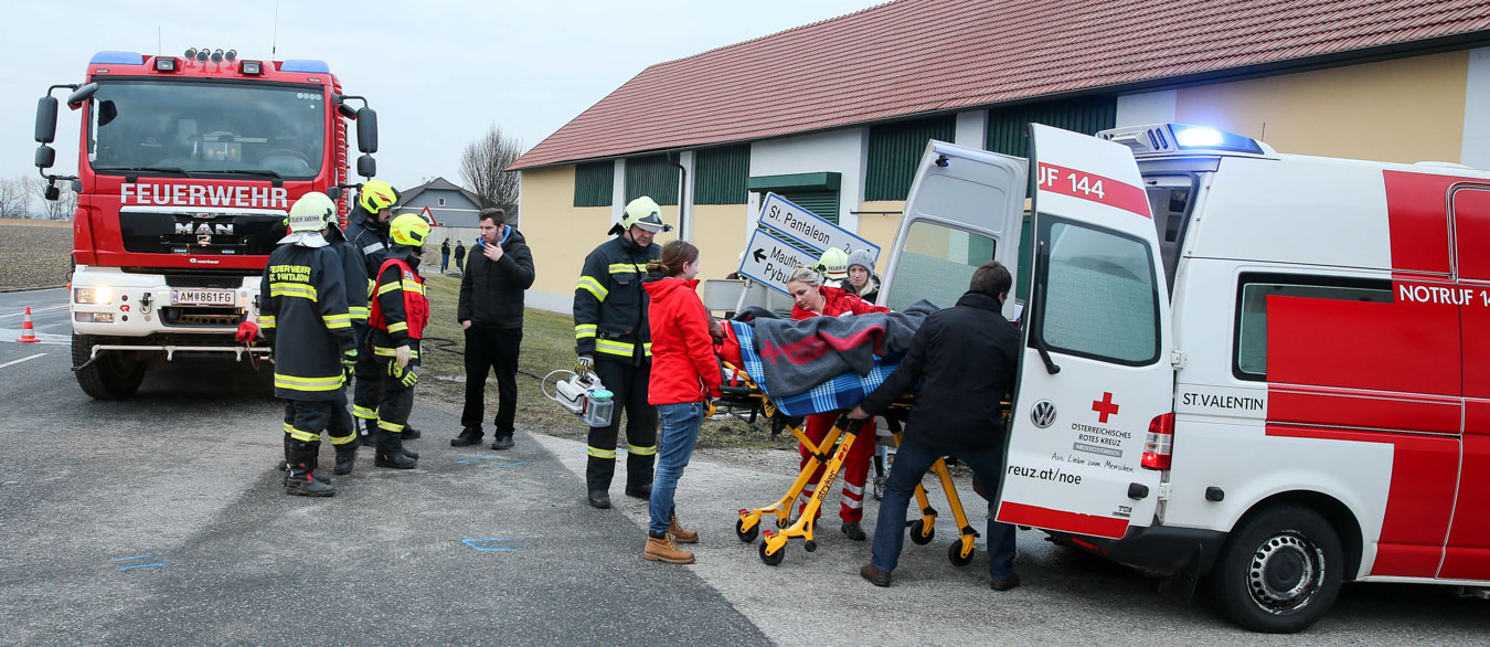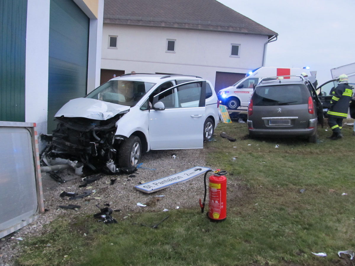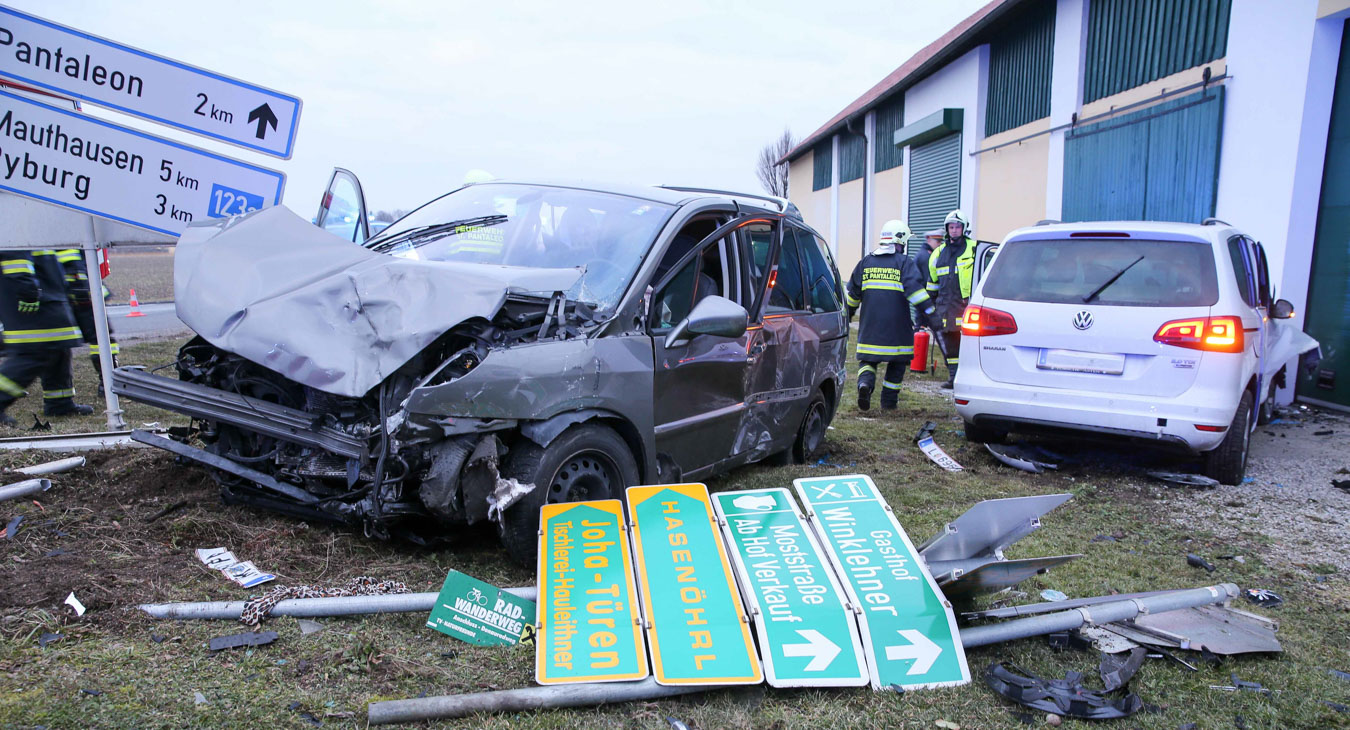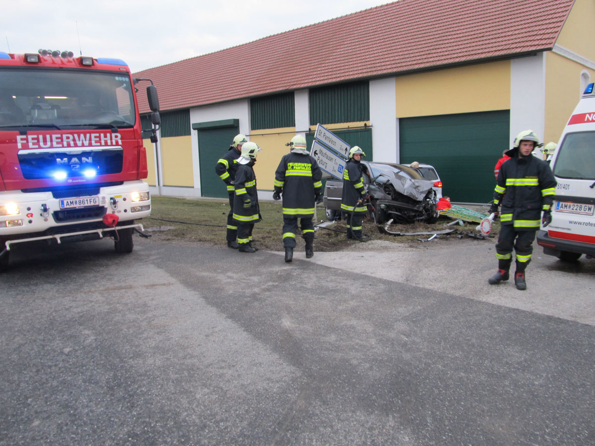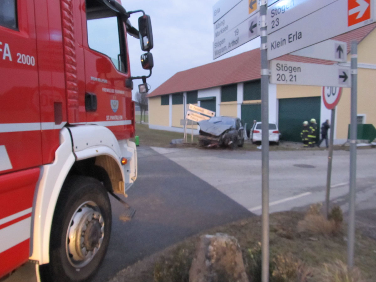 18. Februar 2017 Aus bislang unbekannter Ursache kollidierten am späten Samstag Nachmittag zwei Fahrzeuge an der Kreuzung der B123 und B123a im Bereich Stögen bei St. Pantaleon. Bei dem Zusammenprall wurden drei Personen unbestimmten Grades verletzt, zwei Personen wurden nach der Behandlung durch den Notarzt in ein Linzer Spital gefahren. An beiden Fahrzeugen entstand erheblicher Sachschaden. Nach der Aufnahme des Unfalls durch die Polizei konnte die Feuerwehr St. Pantaleon die Bergung der beiden Wracks durchführen und die Unfallstelle reinigen, sowie ausgetretene Betriebsmittel binden. Die ebenfalls alarmierte Feuerwehr Ennsdorf konnte bald wieder einrücken, als klar war, dass keine Menschenrettung mehr erforderlich ist. Während der Unfallaufnahme sowie der Bergearbeiten war die Kreuzung erschwert passierbar.