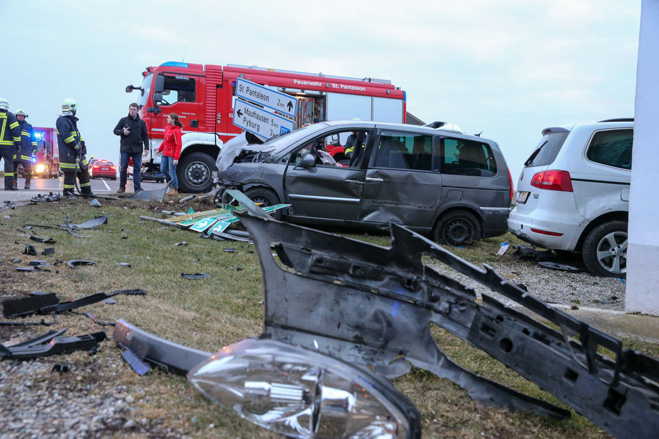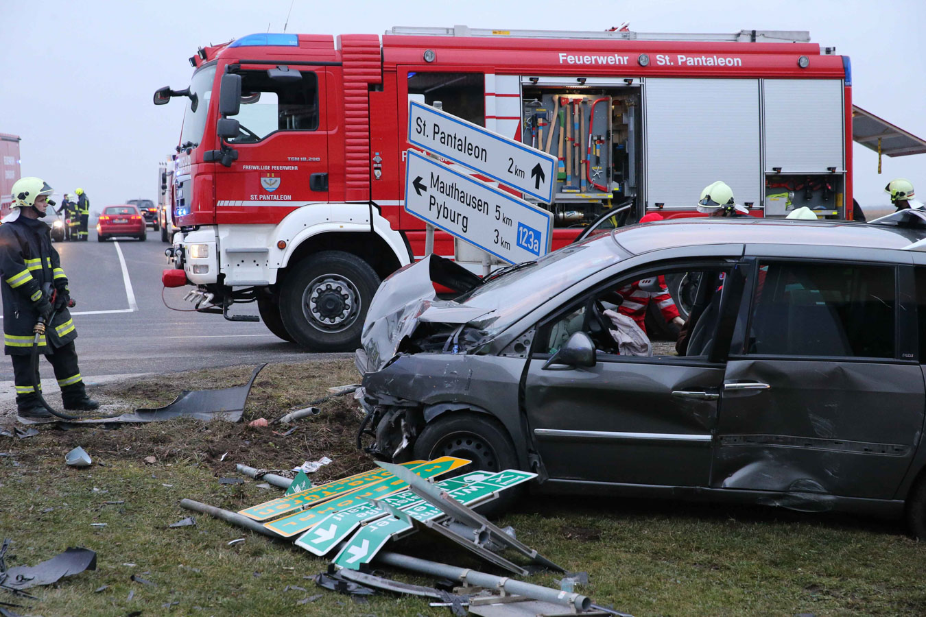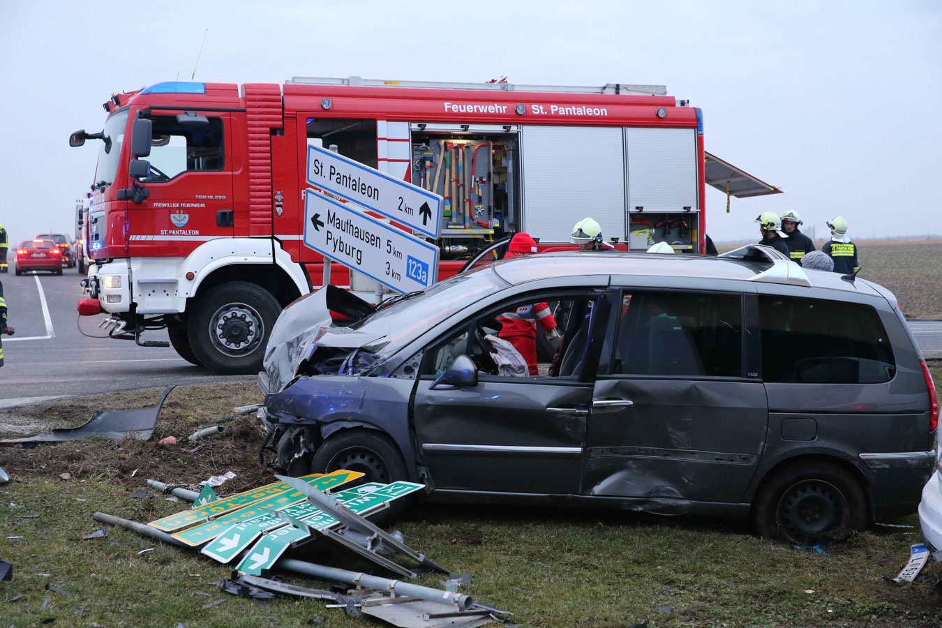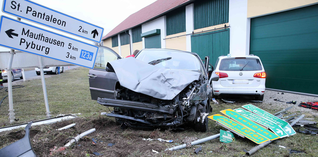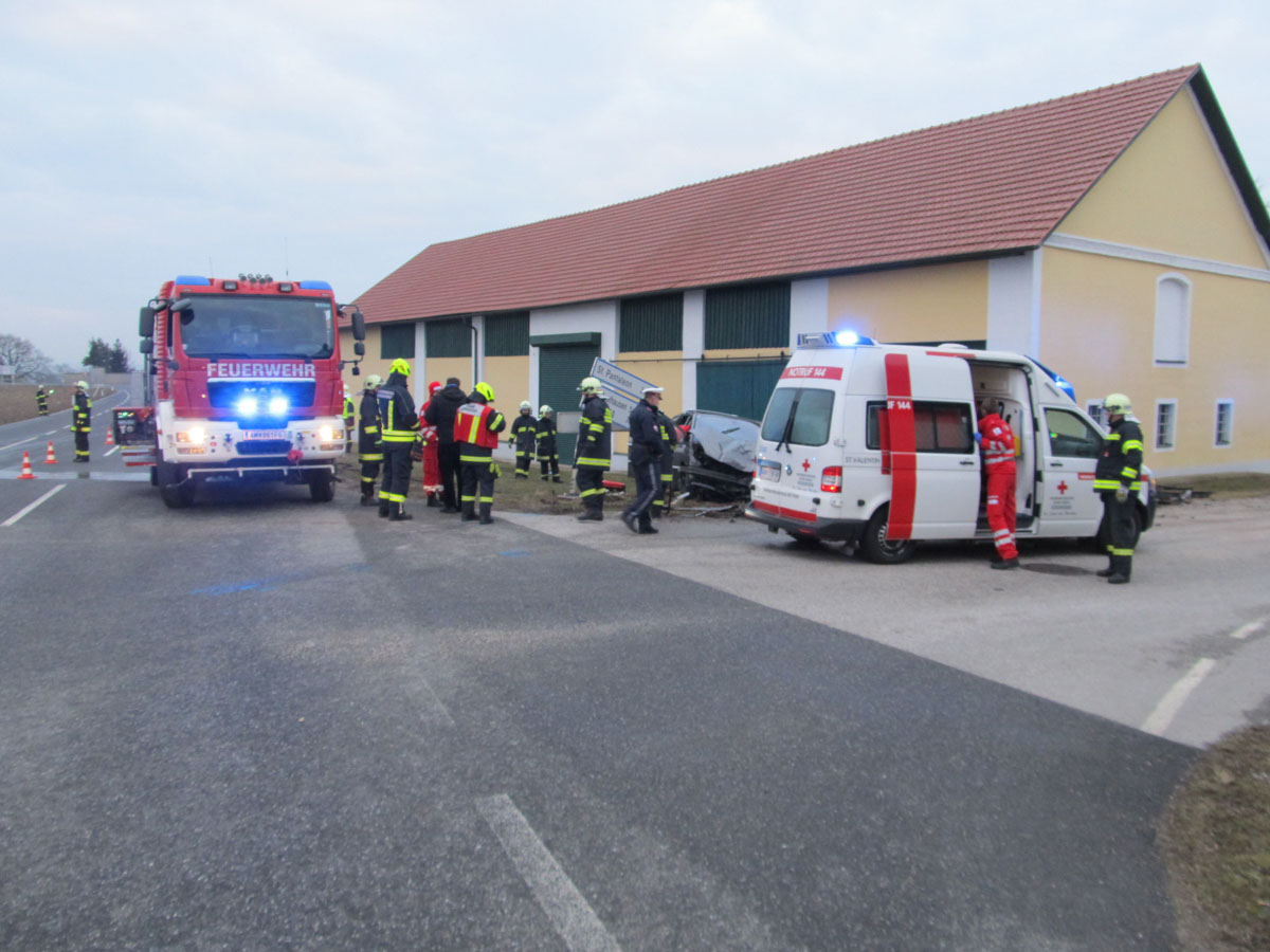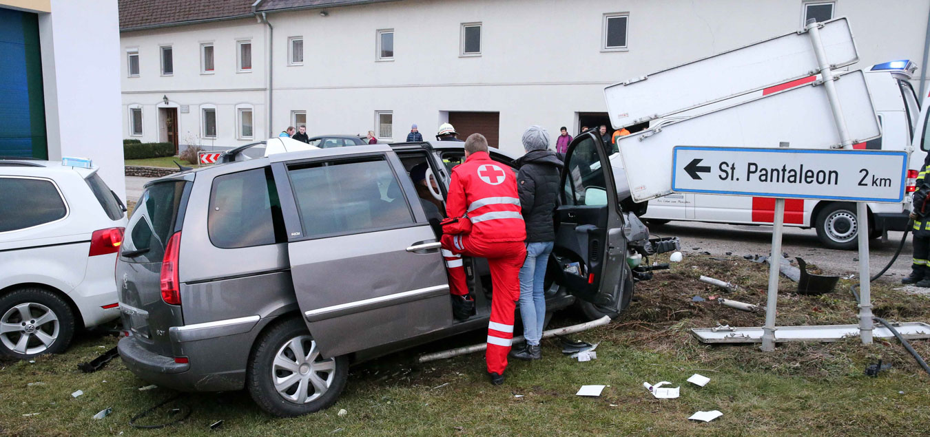 18. Februar 2017 Aus bislang unbekannter Ursache kollidierten am späten Samstag Nachmittag zwei Fahrzeuge an der Kreuzung der B123 und B123a im Bereich Stögen bei St. Pantaleon. Bei dem Zusammenprall wurden drei Personen unbestimmten Grades verletzt, zwei Personen wurden nach der Behandlung durch den Notarzt in ein Linzer Spital gefahren. An beiden Fahrzeugen entstand erheblicher Sachschaden. Nach der Aufnahme des Unfalls durch die Polizei konnte die Feuerwehr St. Pantaleon die Bergung der beiden Wracks durchführen und die Unfallstelle reinigen, sowie ausgetretene Betriebsmittel binden. Die ebenfalls alarmierte Feuerwehr Ennsdorf konnte bald wieder einrücken, als klar war, dass keine Menschenrettung mehr erforderlich ist. Während der Unfallaufnahme sowie der Bergearbeiten war die Kreuzung erschwert passierbar.