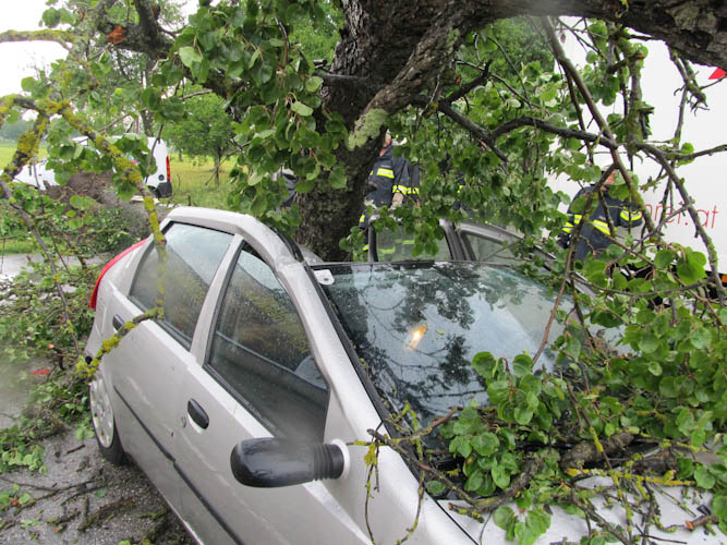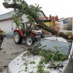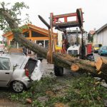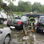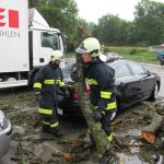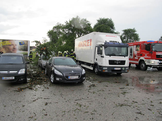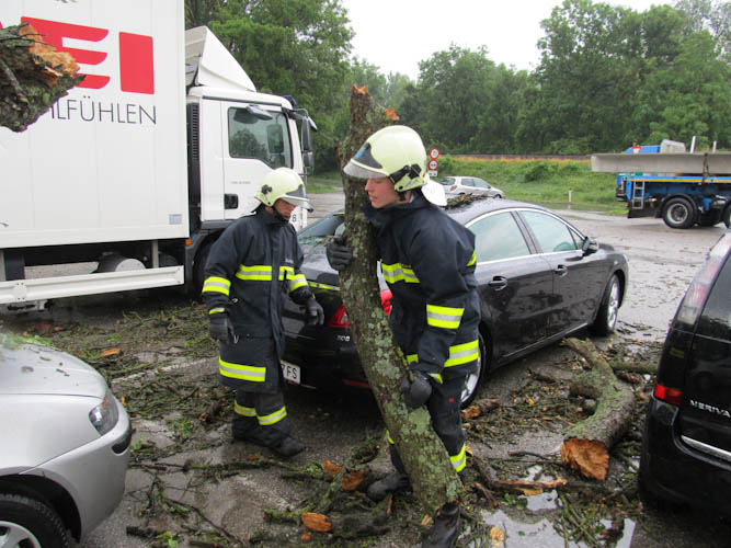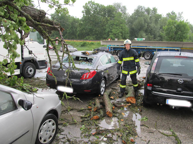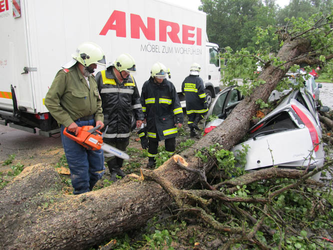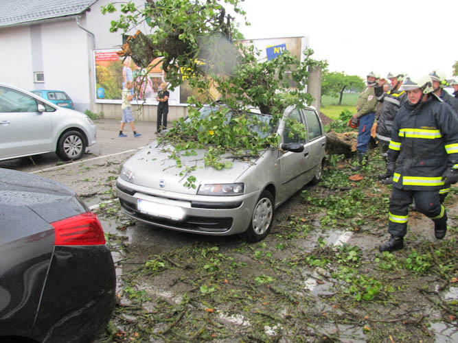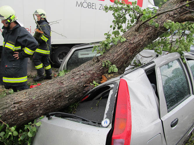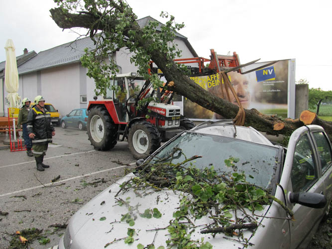 08. Juni 2011 Dramatische Bilder beim Eintreffen der Feuerwehr am Einsatzort. Der durch den Sturm entwurzelte Baum prallte auf einen parkenden PKW. Nach sofortiger Lageerkundung des Einsatzleiters kam die Entwarnung: „Gott sei Dank nur Sachschaden und keine verletzten Personen!“