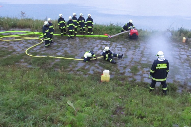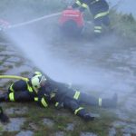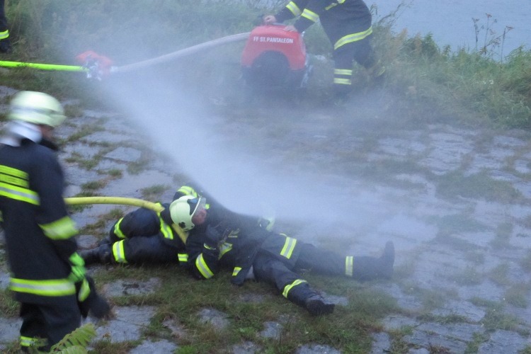 Unter sehr realistischen Bedingungen wurde die Brandbekämpfung mit dem Strahlrohr geübt.