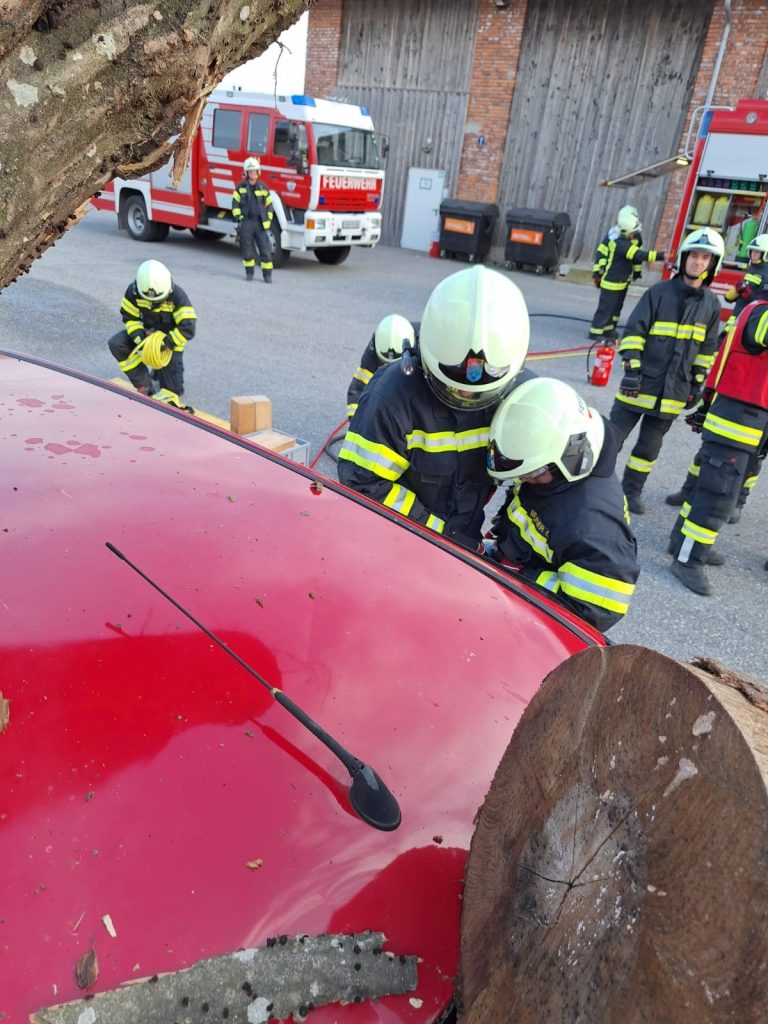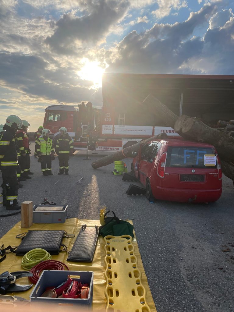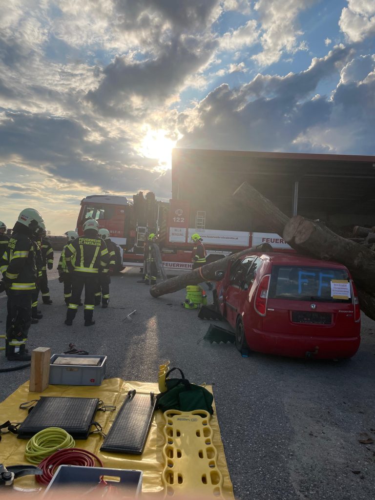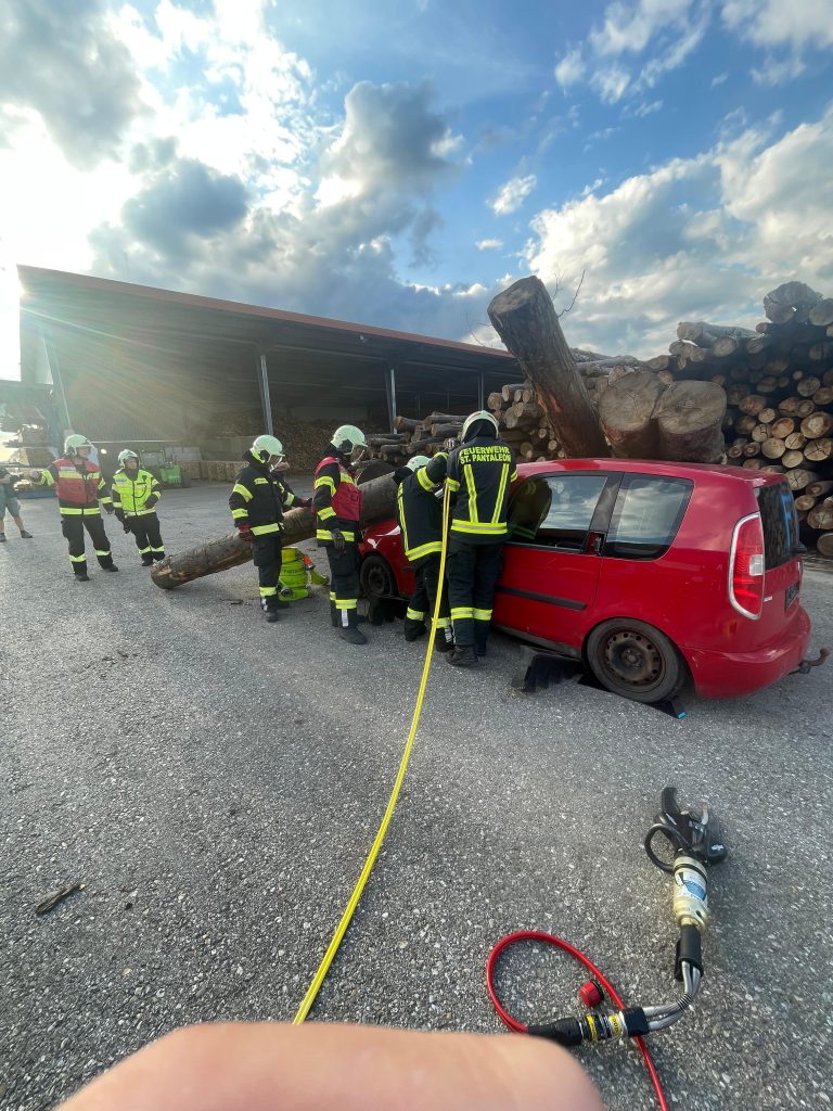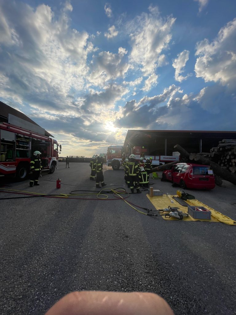 Am Freitag, den 18. Juli, fand eine technische Übung mit einem herausfordernden Szenario statt: Mehrere Baumstämme waren auf ein Fahrzeug gestürzt, zwei Personen wurden im Inneren eingeklemmt. Nach dem Absichern des Fahrzeugs und dem Aufbau eines zweifachen Brandschutzes konnte gemeinsam mit der FF St. Valentin die Menschenrettung durchgeführt werden. Mit Unterstützung von Hebekissen wurden die beiden eingeklemmten Personen erfolgreich befreit.