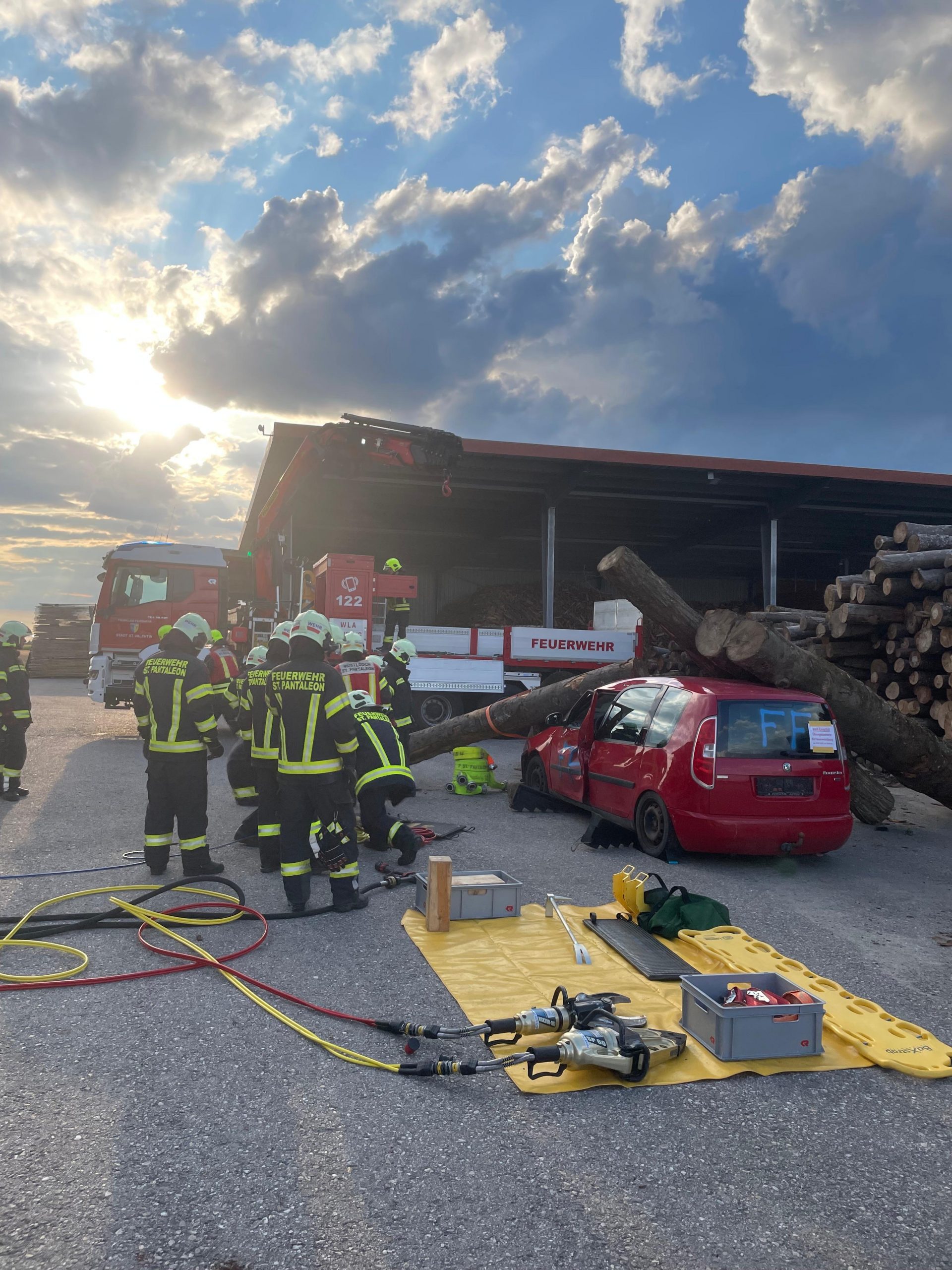 Am Freitag, den 18. Juli, fand eine technische Übung mit einem herausfordernden Szenario statt: Mehrere Baumstämme waren auf ein Fahrzeug gestürzt, zwei Personen wurden im Inneren eingeklemmt. Nach dem Absichern des Fahrzeugs und dem Aufbau eines zweifachen Brandschutzes konnte gemeinsam mit der FF St. Valentin die Menschenrettung durchgeführt werden. Mit Unterstützung von Hebekissen wurden die beiden eingeklemmten Personen erfolgreich befreit.