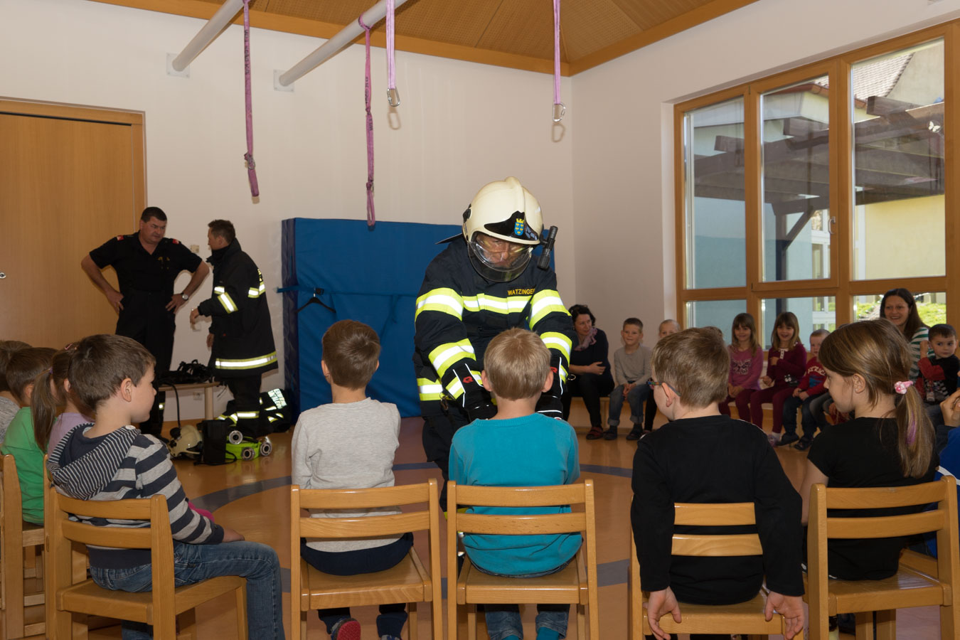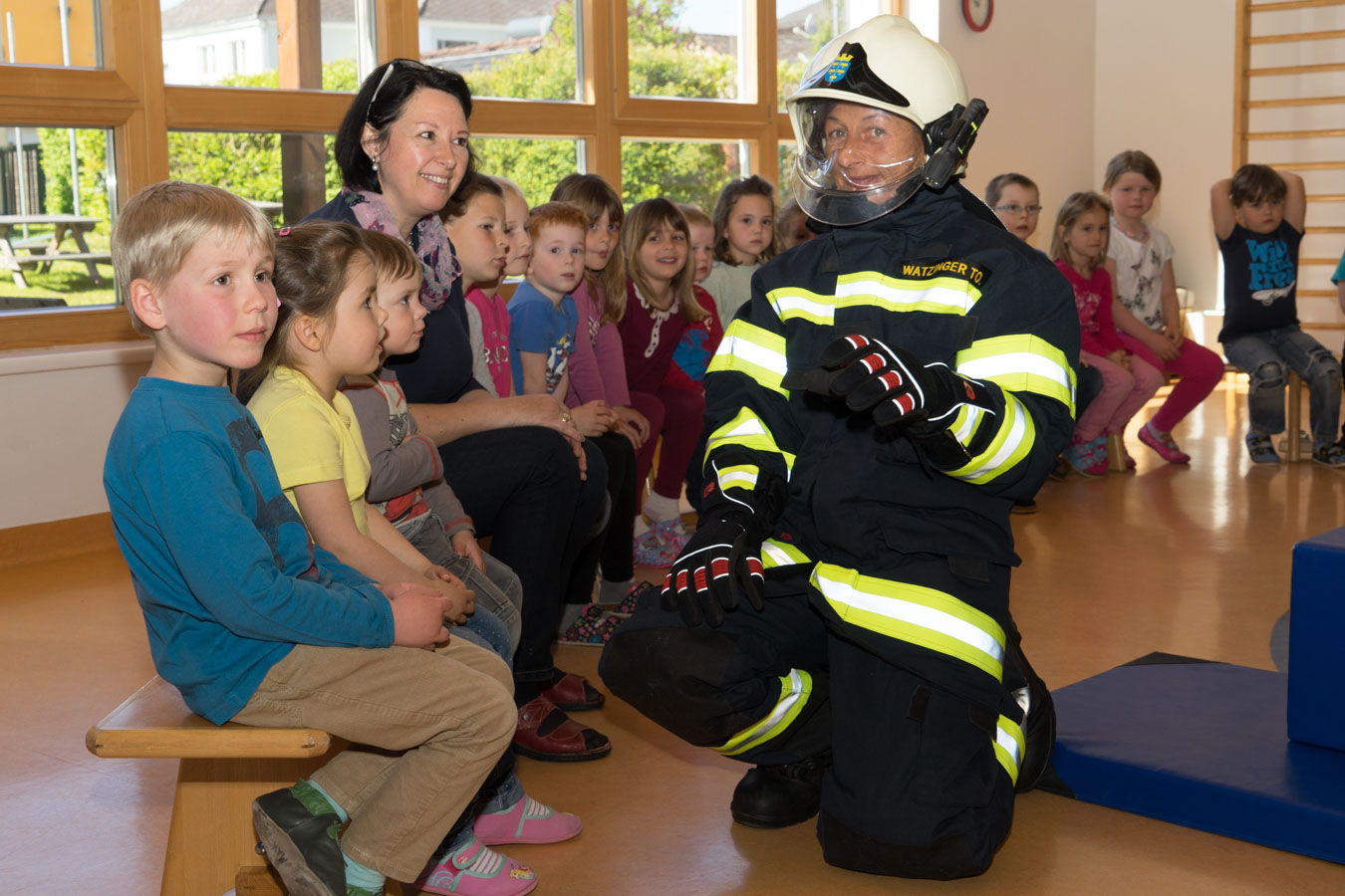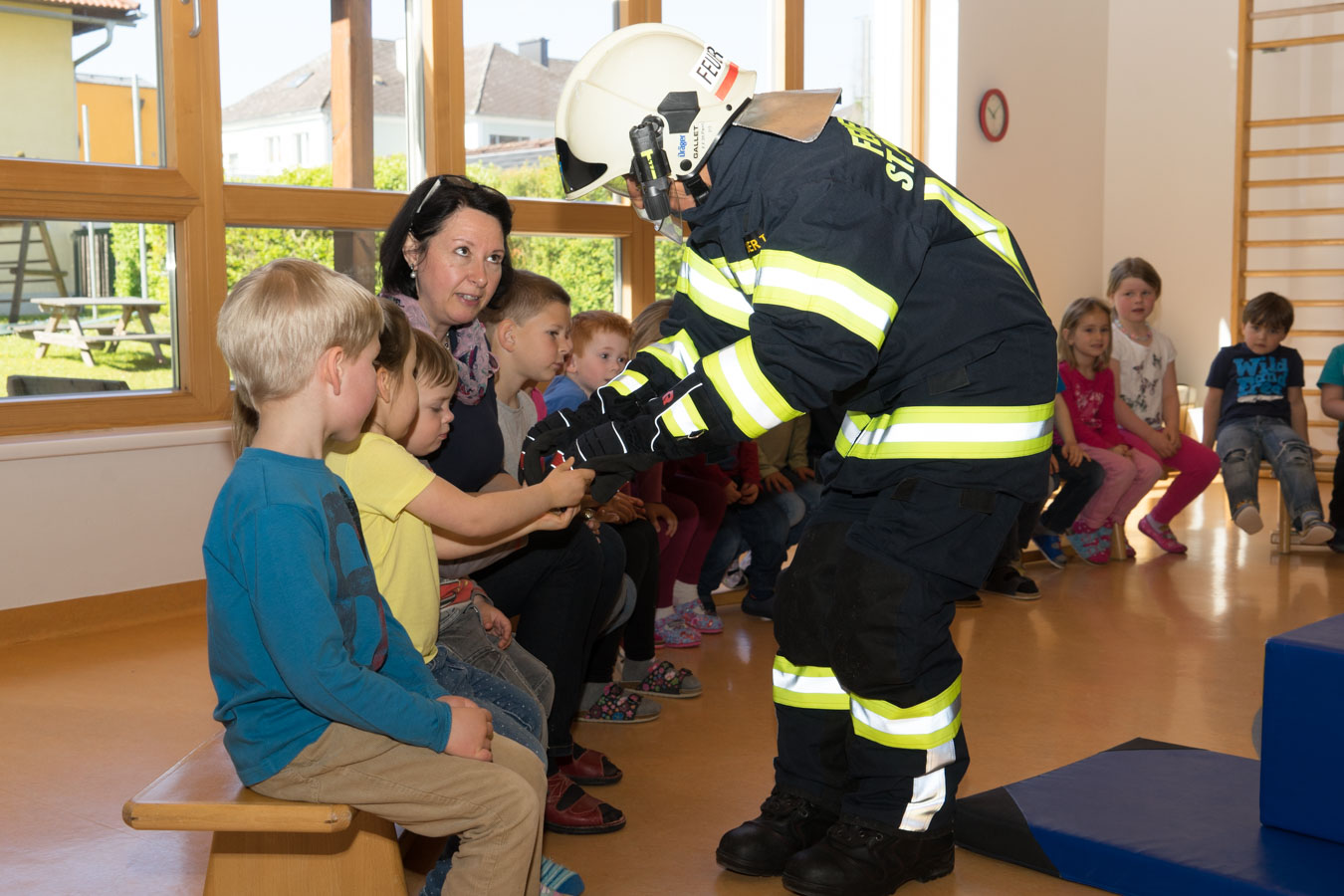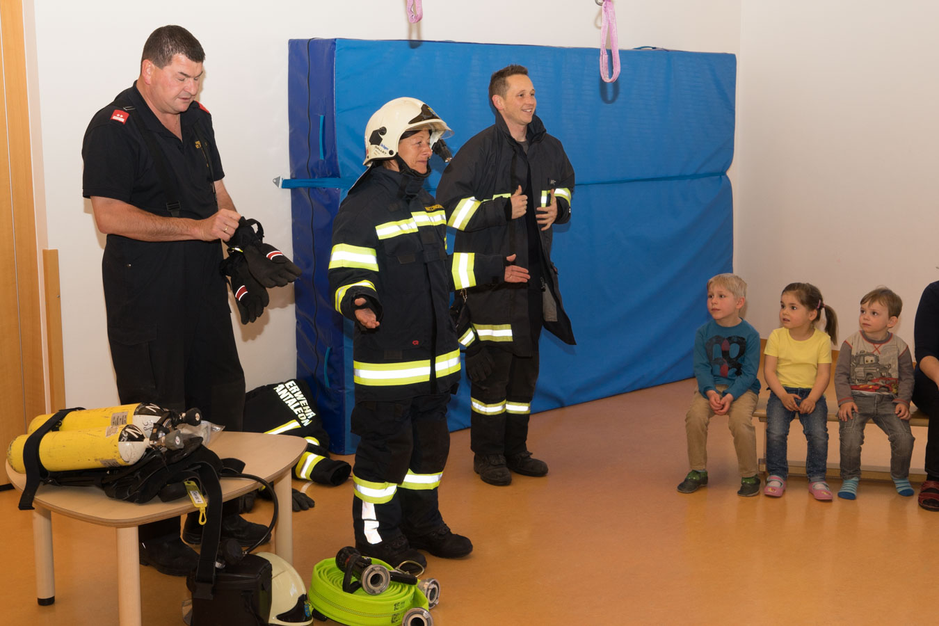 Als Vorbereitung auf die Einsatzübung im Kindergarten St. Pantaleon besuchten wir die Kinder um sie mit den Aufgaben und der Ausrüstung der Feuerwehr vertraut zu machen.