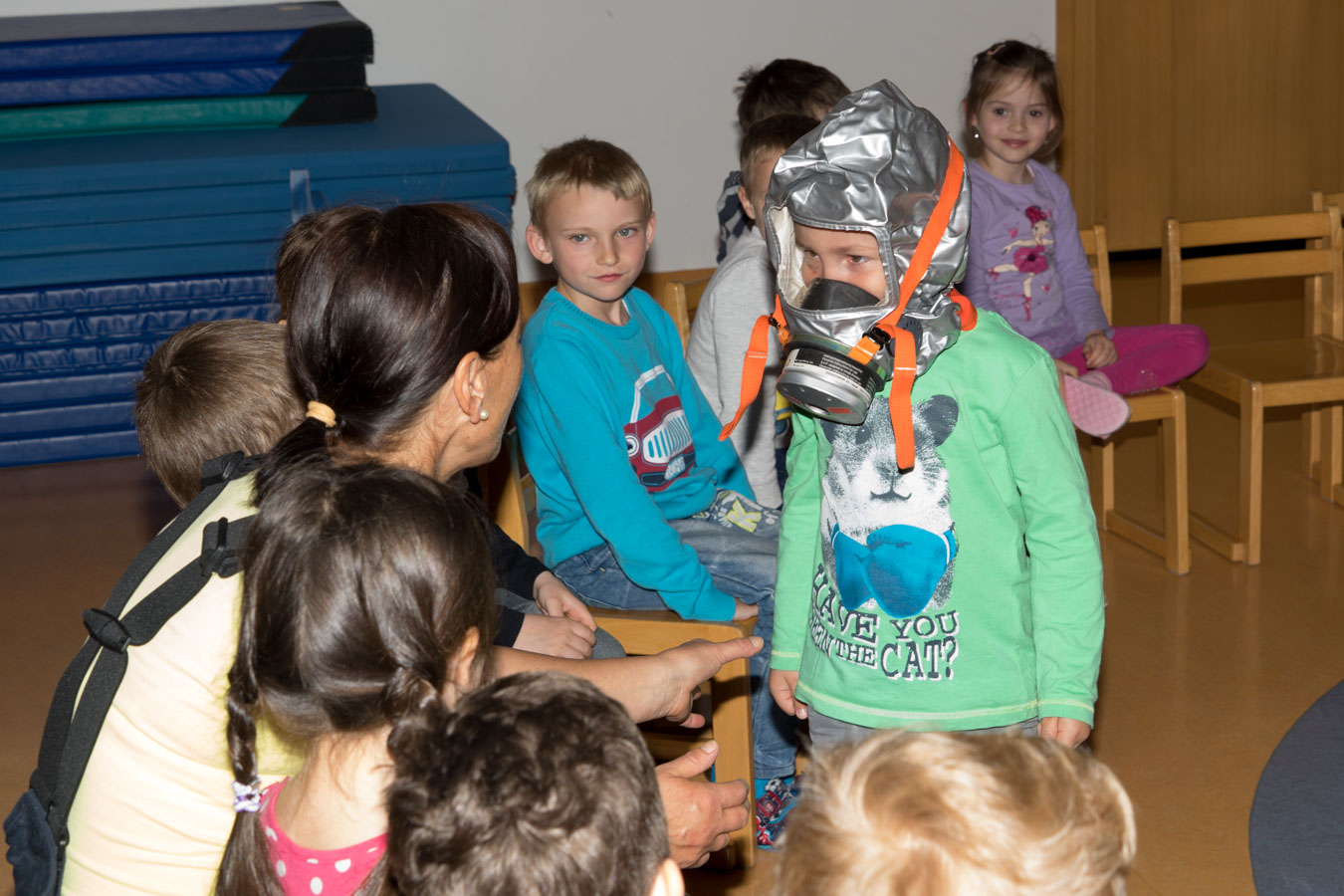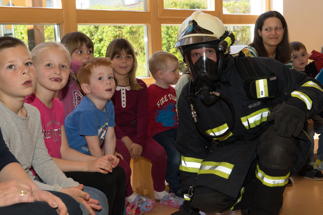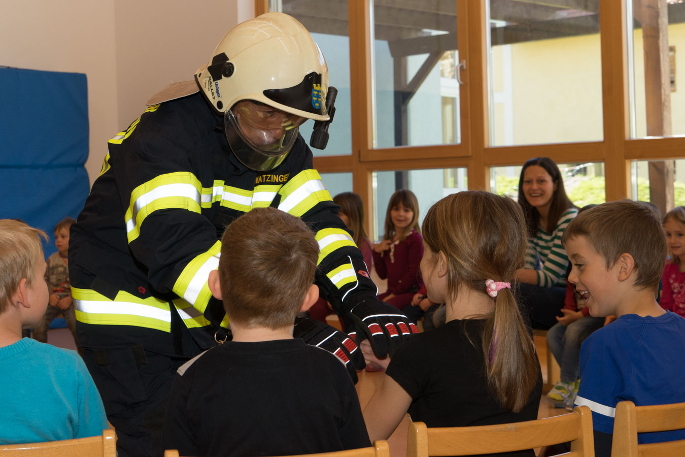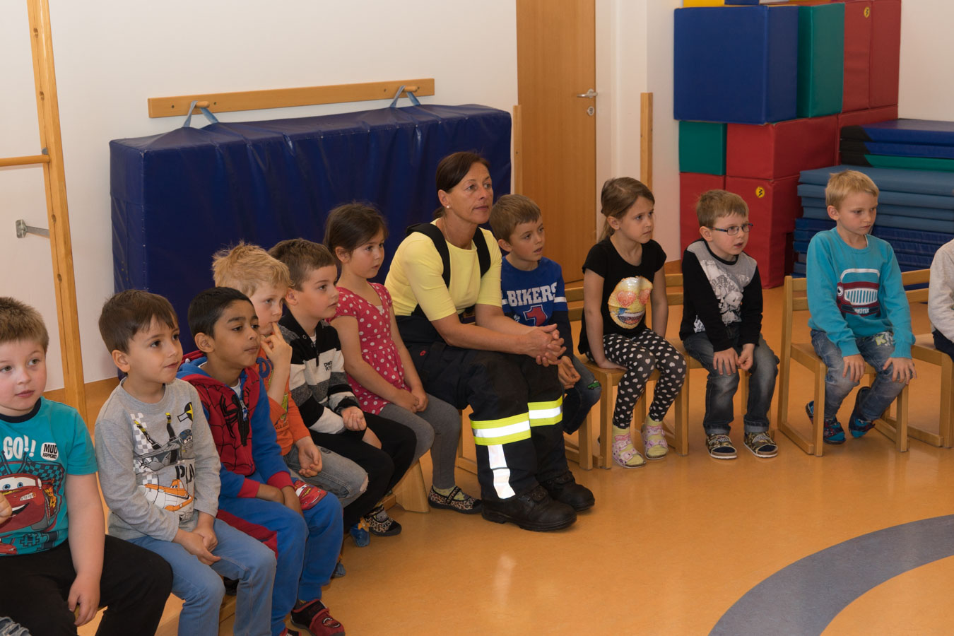 Als Vorbereitung auf die Einsatzübung im Kindergarten St. Pantaleon besuchten wir die Kinder um sie mit den Aufgaben und der Ausrüstung der Feuerwehr vertraut zu machen.